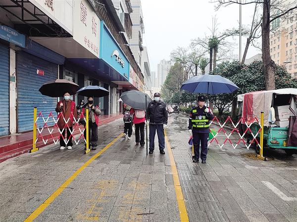 进入冬季,气温骤降,志愿者依旧坚守护学岗,暖心守护学生上下学。据介绍,为确保中小学生上下学期间安全,川汇区常态化开展护学工作,定人定岗定责,织密护学安全网,确保家长放心、师生安心。图一为志愿者守护周口市第六幼儿园学生安全入园。图二为志愿者、义警、安保人员共同守护七一路二小学生安全。记者 韩志刚 摄