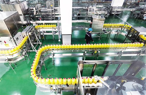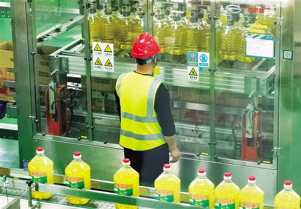 益海(周口)粮油工业有限公司年加工140万吨大豆项目,总投资15亿元,全部投产后,预计年加工大豆140万吨、年精炼油脂52万吨、年灌装中小包装30万吨、年加工膨化大豆粉12万吨,可实现年产值60亿元、年纳税2亿元,安置约400人就业。目前,该项目已建成达效。图为生产车间一角。
