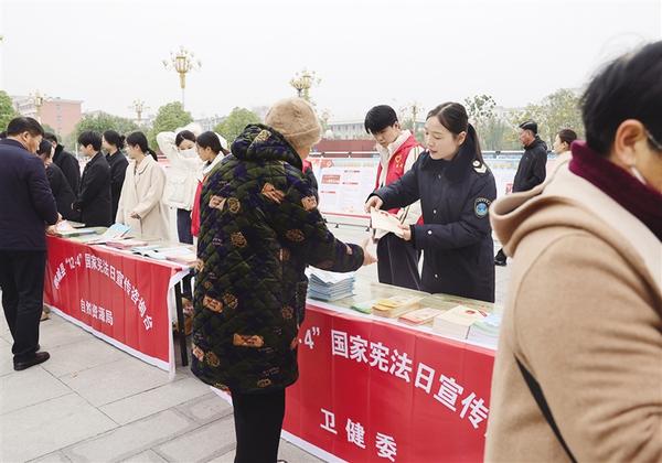 本报讯 (记者 徐松 通讯员 侯同廷 文/图)为进一步增强广大群众的法治意识,营造良好法治氛围,让他们了解宪法、学习宪法、尊崇宪法、遵守宪法、维护宪法、运用宪法,12月4日上午,郸城县卫生健康委员会按照全县统一部署,在该县世纪广场开展以“大力弘扬宪法精神,推动进一步全面深化改革”为主题的“国家宪法日”宣传活动。