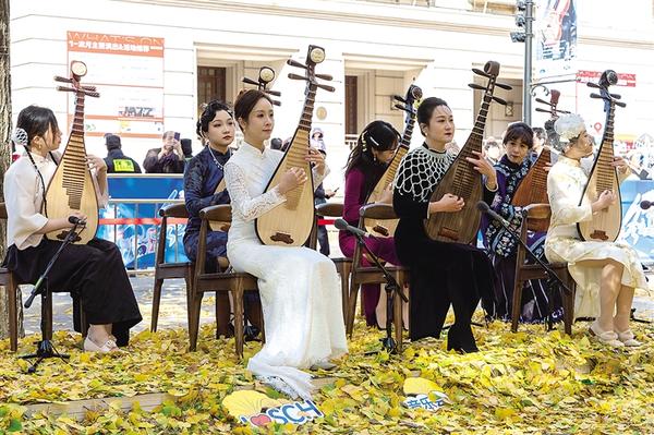 12月8日,青年音乐家在银杏树下演奏。当日,一年一度的“银杏音乐会”在上海音乐厅南广场举行。