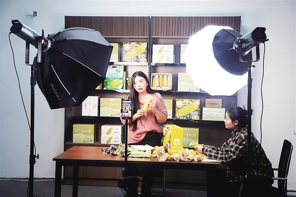 近年来,项城市丁集镇东街村通过党支部领办合作社,拉长农业产业化链条,大力发展农产品精深加工产业。图为该村组织人员通过电商直播方式销售糯玉米,让农产品搭上“电商快车”。 记者 张志新 通讯员 张永久 摄