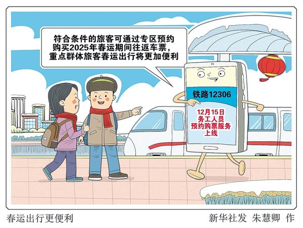 据新华社北京12月15日电(记者 樊曦)记者从铁路12306科创中心获悉,15日,铁路12306手机客户端务工人员预约购票服务上线,符合条件的旅客可通过专区预约购买2025年春运期间往返车票,重点群体旅客春运出行将更加便利。