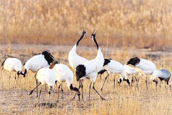 目前,大批丹顶鹤飞抵江苏盐城湿地珍禽国家级自然保护区越冬。该保护区位于黄海之滨,是全球9条候鸟迁飞通道之一的“东亚-澳大利西亚”路线上的重要一站,每年都有超过600只野生丹顶鹤来这里越冬。