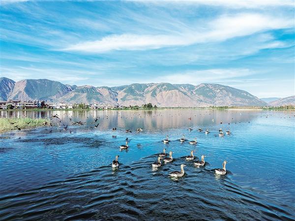 12月15日,一群灰雁在云南省大理白族自治州洱源县茈碧湖湿地栖息、觅食(无人机照片)。