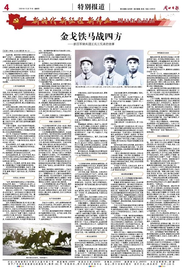 当年彭雪枫率部征战豫东,杜岗会师、首战窦楼、砺兵刘大楼、整训白马驿……抗日的大旗召唤众多热血青年参军报国。无数优秀的周口儿女加入新四军,其中一批有幸成为新四军骑兵团的将士,金戈铁马,战功卓著。太康王氏三兄弟,则是他们中的代表。②15
