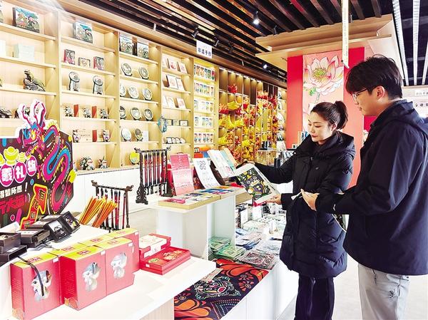 12月18日,在太昊伏羲陵文化旅游区旅游产品展厅,游客在欣赏非遗手工产品。近年来,太昊伏羲始祖旅游区运营管理有限公司为丰富游客体验,聚焦非遗手工、潮玩手办等主题,开发了近百个旅游新产品,以满足游客多元化需求。 记者 侯俊豫 摄