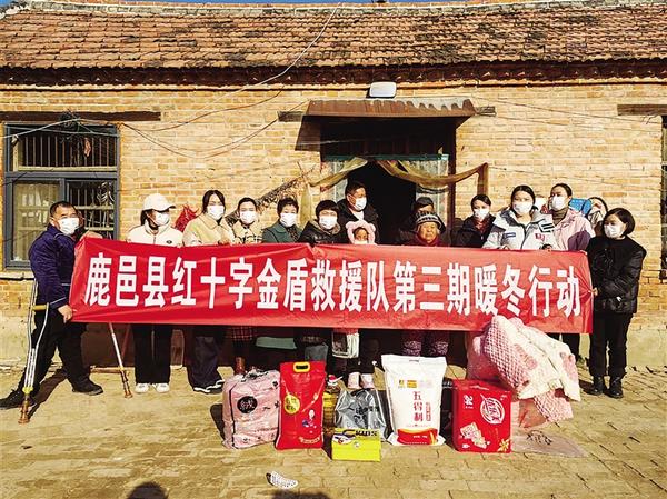 连日来,鹿邑县红十字金盾救援队积极组织开展第三期暖冬行动,为部分困难群众送去温暖与关怀。图为志愿者与受助群众合影留念。 记者 侯国防 通讯员 王露 摄
