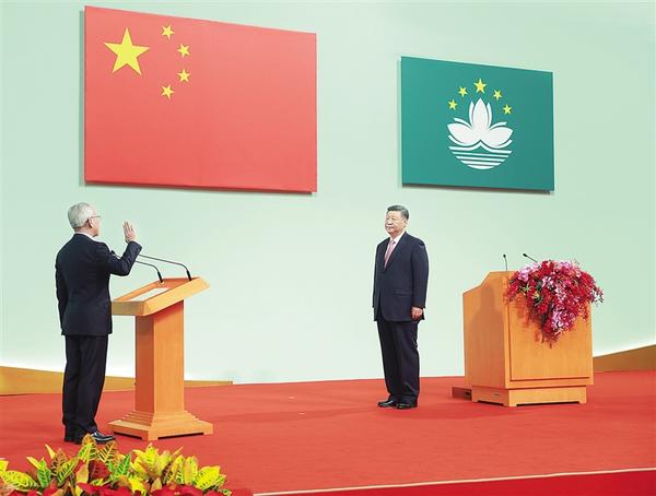 新华社澳门12月20日电 (记者 朱基钗 赵博 张研)庆祝澳门回归祖国25周年大会暨澳门特别行政区第六届政府就职典礼20日上午在澳门东亚运动会体育馆隆重举行。中共中央总书记、国家主席、中央军委主席习近平出席并发表重要讲话。他指出,澳门回归祖国25年来,具有澳门特色的“一国两制”实践取得巨大成功,澳门发生翻天覆地的变化,国际影响力大幅提升。他希望,新一届澳门特别行政区政府团结带领社会各界,抢抓机遇、锐意改革、担当作为,更好发挥“一国两制”制度优势,不断开创“一国两制”事业高质量发展新局面。