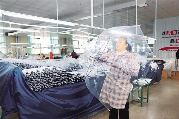 裁片、合片、钉扣、装伞骨、检验、包装……12月24日,记者走进中国伞业之乡郸城县伞业产业园,三和雨具、雅姿制伞、兆亿伞业、昌达工贸、珍妮花伞业等16家企业生产正忙,工人各司其职,一把把形式各样的雨伞在这里加工而成,随后销往世界各地。据悉,制伞业是郸城县特色产业,全县现有制伞企业120多家,伞业产业园在乡村设立240个车间,年产值达10.3亿元,从业人员达4万人。