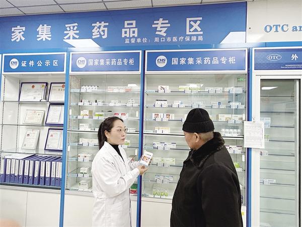 图为周口市中心城区某试点药店工作人员为市民讲解集采药品进药店政策。