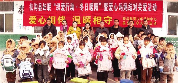 12月24日,扶沟县妇联联合扶沟县教体局组织志愿者到曹里乡开展“ 织爱行动·冬日暖阳”暨爱心妈妈结对关爱活动,为秦岗小学、王家小学的50名留守儿童送去书包、帽子、围巾、手套等,帮助他们度过一个温暖的冬天。记者 金月全 摄