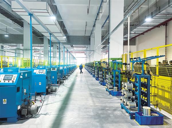 近两年来,沈丘县委、县政府积极支持河南凯旺电子科技股份有限公司进行设备更新和智能化改造。该公司先后投入资金2亿元,对原有设备实施智能化改造和设备更新,年产3500万套电子精密连接器及模具产品高端化设备改造项目突破了线缆组件IP67等级防水、阻断式防水、产品信号完整性处理、产品抗电磁干扰及防辐射、超精密塑胶模具设计、CCD自动检测、极小间距产品自动插针技术等20多项核心技术。图为自动化拉丝生产线一角。
