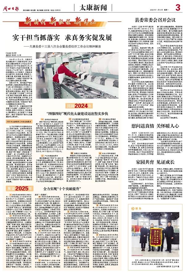 本报讯(记者 张洪涛 通讯员 郭留艺 段亚博) 2024年12月30日,太康县委常委会召开会议,传达学习习近平总书记近期重要讲话重要指示重要文章精神,研究部署党风廉政建设和反腐败斗争、党内法规、县委巡察、社会维稳、软弱涣散村整顿等重点工作。市委常委、县委书记马剑平主持会议并讲话。县长张峰出席会议。