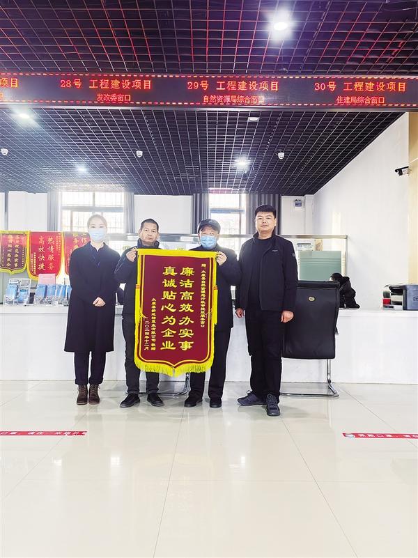 近日,太康县某置业公司相关负责人将一面印有“廉洁高效办实事 真诚贴心为企业”字样的锦旗送到县自然资源局,感谢工作人员为他们提供优质、高效、热情的服务。 记者 张洪涛 通讯员 王立平 摄