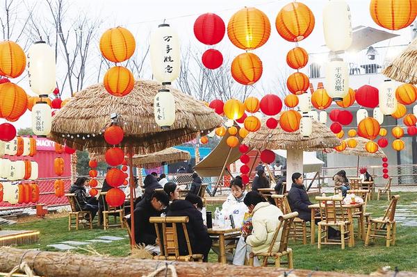 近日,周口首届永福新春游园会在引黄调蓄湖畔启动,吸引不少群众前去看文艺演出、逛文创集市、尝传统小吃。图一为群众在露营地休息。图二为群众乘船游玩。