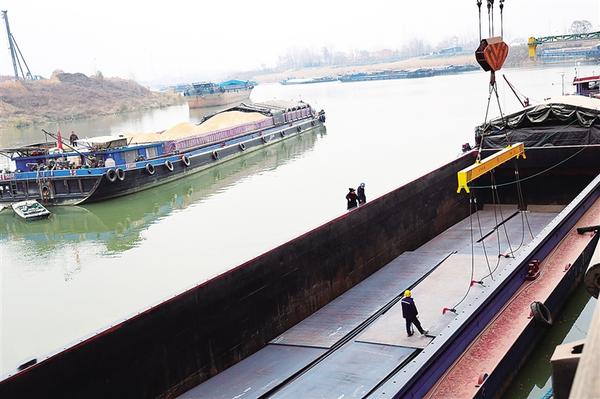宽厚板项目建成投产后,河南钢铁集团周口基地全力以赴抓好生产经营,加快推进宽厚板产线生产和后续建设工作,并积极主动做好市场营销,持续提升产品竞争力和创效能力。图为1月3日,周口基地生产的板材正在装船,通过水路运往下游企业。记者 刘俊涛 摄