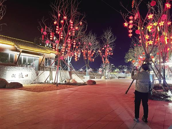 夜幕降临,华灯初上,滨河渡口文化带、关帝庙历史街区等像是披上了五彩霓裳,流光溢彩。1月8日19时,在大渡口码头遗址,市民苏女士正用手机对着树上的灯饰拍照,她说:“最近,吃过晚饭后,我就会到这边散散步,树上的彩灯和福字,十分喜庆。”在关帝庙历史街区,记者看到各式各样的景观灯纷纷被点亮,衬托出祥和喜庆、欢乐美好的氛围,充分展现着“中国年·周口味”的迷人魅力。