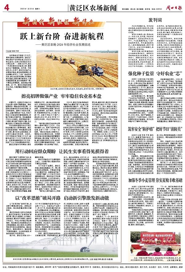全年粮食总产突破2.25亿斤,育种创新攻关捷报频传,“黄泛区”牌优质农产品叫响全国,历史文化街区成功入选第三批省级历史文化街区名单……回眸2024年,成立一年多的黄泛区农场党工委、管委会交出了满意答卷。在市委、市政府的关心支持下,黄泛区农场产业发展稳步推进,新动能持续释放;民生保障扎实有力,“三保”底线兜牢兜实,群众生活更有保障;项目建设势头强劲,发展支撑不断夯实;人居环境显著改善,城乡面貌焕然一新;干事创业热情高涨,服务效能大幅提高。这一年,黄泛区农场各领域齐头并进,为高质量发展奠定了坚实基础。