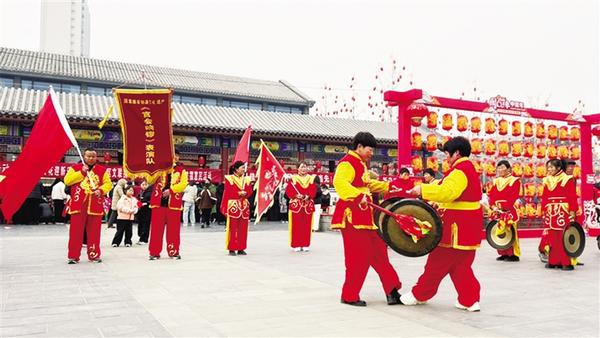 1月22日,国家级非物质文化遗产项目官会响锣在“三川十馆·春会”关帝庙文化广场正式上演。表演以锣为道具,组成各种造型,时打时舞,引得不少游客上前观看。记者 何晴 摄