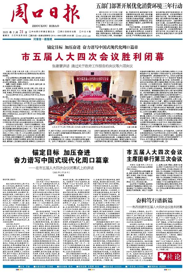 本报讯 (记者 王艳 刘昂 王晨) 2月20日下午,周口市第五届人民代表大会第四次会议圆满完成各项议程后胜利闭幕。