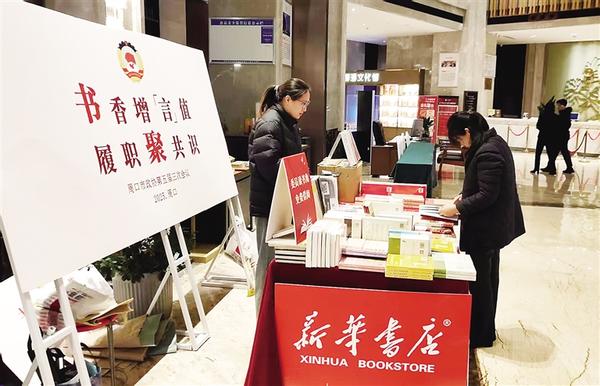 2月16日,在周口饭店、周口天明锦江国际酒店,周口市新华书店的书台吸引了代表委员们的目光。周口市新华书店把书店“搬”进市两会现场,供代表委员借阅,满足代表委员个性化的学习需求,助力其高效履职。记者 黄佳 通讯员 张航硕 摄