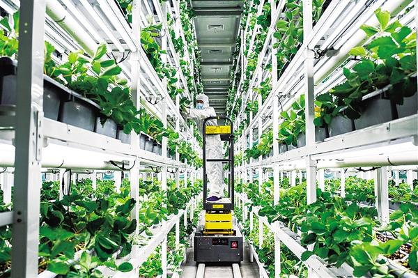 2月28日,在位于呼和浩特市回民区的内蒙古宇生乐谷丰现代农业产业园的植物工厂,工作人员在管护草莓植株。