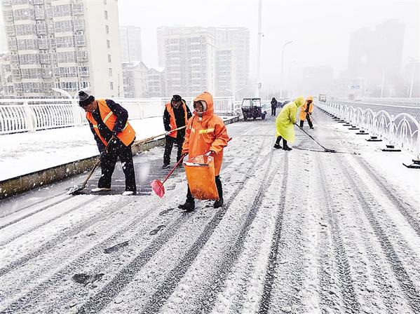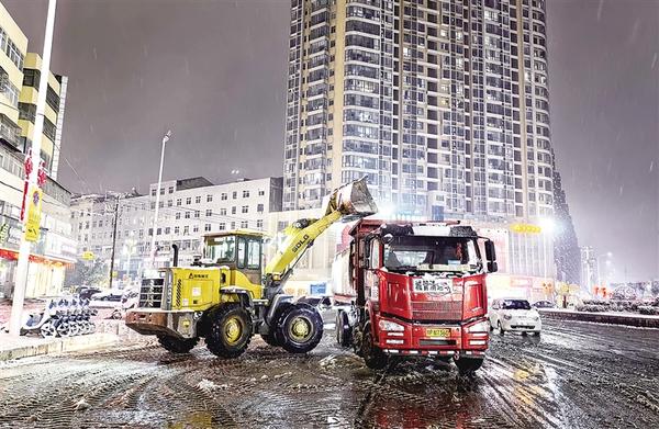3月3日,我市迎来暴雪天气,各地相关部门按照提前部署的对策,积极应对,科学组织机械人力,扎实做好低温雨雪冰冻灾害防范工作,全力保障辖区交通顺畅、群众出行安全。图为郸城县(左)、市城乡一体化示范区(上)组织机械人力及时清除道路积雪。