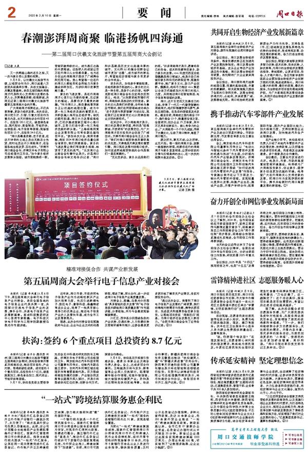 本报讯(记者 金月全 通讯员 闫硕)第二届周口伏羲文化旅游节暨第五届周商大会期间,扶沟县借势开展系列招商活动,推动项目签约、产业对接,取得突破性成果,成功签约6个重点项目,总投资约8.7亿元,涵盖服装加工、绿色食品加工、现代农业、节能环保等领域。
