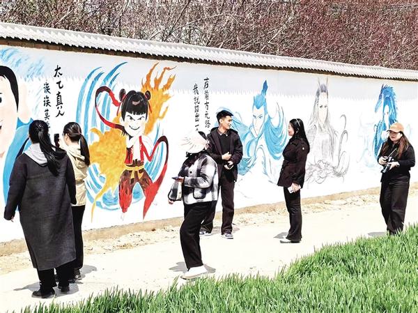 近日,淮阳区委统战部驻刘振屯镇夏楼村工作队联合村“两委”、村幼儿园在村主干道墙体上创作长100米的以哪吒为主题的墙绘,吸引众多群众打卡。记者 侯俊豫 通讯员 王梦宇 摄