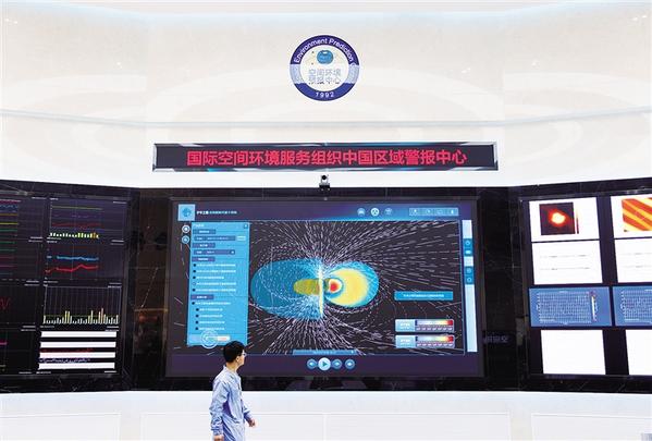 3月20日,在位于北京怀柔的子午工程综合信息与运控中心大楼,一名科研人员走过空间环境预报中心。