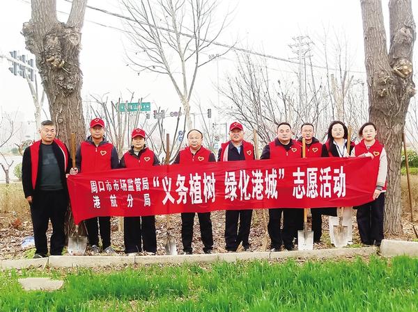 近日,周口市市场监管局港航分局组织全体党员干部在周口临港开发区祁连山路东段园林绿化区开展“义务植树 绿化港城”志愿活动,以实际行动为建设临港开发区贡献力量。记者 宋风 通讯员 王燕 摄