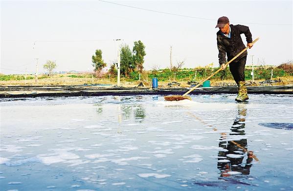 3月24日,工作人员在浙江省乐清市南塘镇山马晒盐场收盐。 春日气温回升,正是采用日晒、调卤、结晶等古法晒盐的好时节,在浙江省乐清市南塘镇山马晒盐场,工作人员趁着晴好天气忙着晒盐收盐。 新华社发(蔡宽元摄)