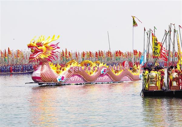 4月6日,龙船行驶在湖面上。 当日,2025泰州姜堰溱潼会船在江苏省泰州市姜堰区溱湖国家湿地公园开幕,500多条各式船只和上万名会船选手飞篙走桨、弄潮击浪,演绎历久弥新的民俗画卷。“天下会船数溱潼,溱潼会船甲天下。”溱潼会船又名清明会,由南宋相沿至今,历经数百年传承而不衰,已于2008年被列入国家级非物质文化遗产名录。 新华社发 (兰红光 摄)