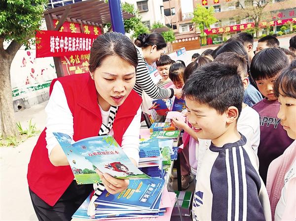 4月9日,志愿者向学生讲解反邪教知识。当天,扶沟县科协联合县委统战部、县民宗局、县教体局开展“铸牢中华民族共同体意识暨民族宗教政策法规宣传月”活动,为回族小学师生送去科普图书及宣传物品2000余件。记者 金月全 通讯员 刘芳 摄
