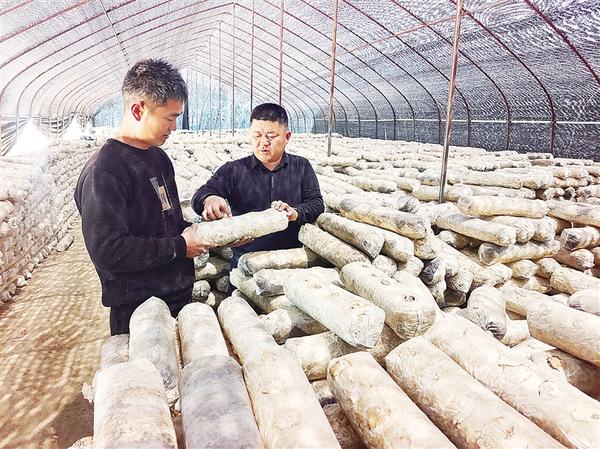4月12日,在淮阳区新站镇王庄行政村香菇种植大棚,村党支部负责人和技术人员正在查看菌棒发育情况。该村利用村民有香菇种植技术的优势,成立香菇种植合作社,于去年年底开始建设占地约30亩的香菇种植基地。目前,该基地发育香菇菌棒10万棒,预计年产香菇80吨~100吨,产值将达100万元~120万元。