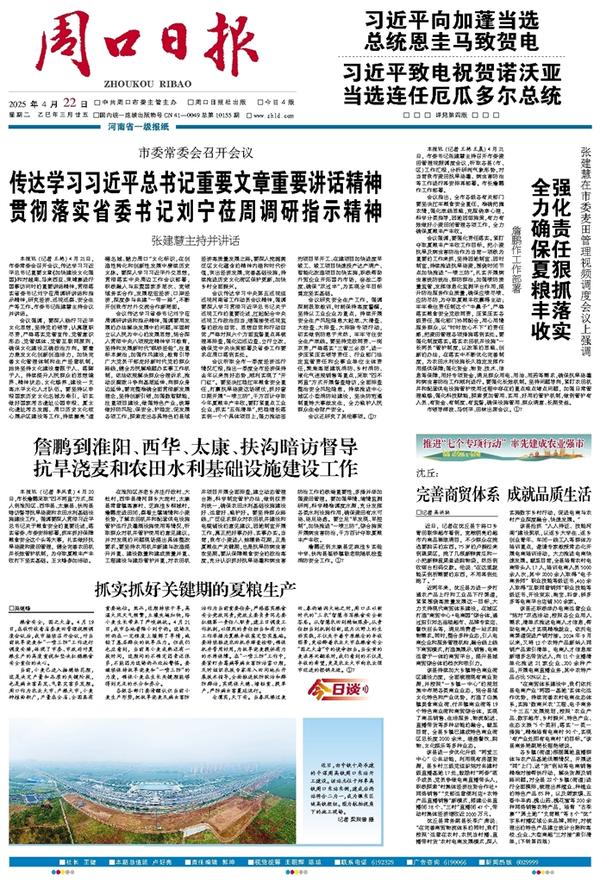 本报讯(记者 李凤霞) 4月20日,市长詹鹏采取“四不两直”方式,深入到淮阳区、西华县、太康县、扶沟县暗访督导抗旱浇麦和农田水利基础设施建设工作,强调要深入贯彻习近平总书记关于粮食安全的重要论述,落实省委、市委安排部署,抓牢抓好保障粮食安全这个头等大事,扎实做好抗旱浇麦和麦田管理,健全完善农田机井长效管护机制,为夺取夏粮丰产丰收打下坚实基础。王文峰参加活动。