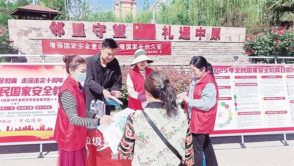 为深入贯彻落实总体国家安全观,增强全民国家安全意识, 近日,市城乡一体化示范区围绕“国家安全重于泰山”等主题,积极开展形式多样的宣传教育活动,推动国家安全理念深入人心。图为志愿者在中原社区宣传国家安全知识。 记者 姬慧洋 摄
