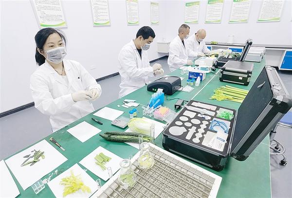 鹿邑县蔬菜现代农业产业园集科技研发、种苗培育、冷链物流、电商展销于一体,依托电商平台和冷链网络,打通“田间到餐桌”绿色通道,年线上销售额突破5000万元,切实带动了周边农户稳定增收。图①:产业园内的水果芹菜长势良好。图②:产业园检测中心技术人员正在对农产品进行质量检测。图③:产业园工作人员通过网络销售农产品。记者 王映 摄