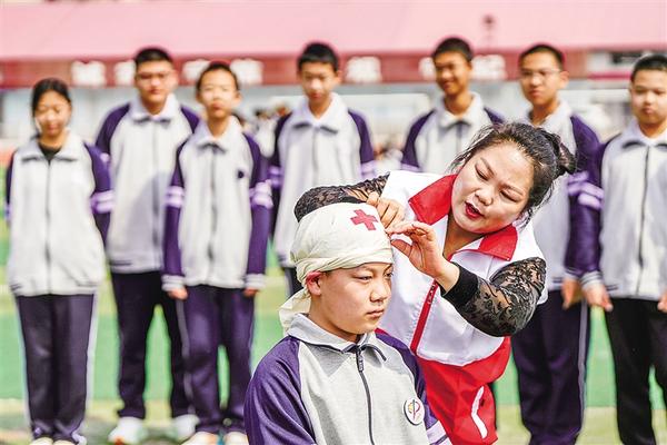 5月7日,红十字会的志愿者在河北省遵化市第二中学为学生传授伤员包扎急救技能。