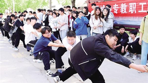 为丰富校园文化生活,增强学生体质,4月29日至30日,项城市中等专业学校举行了一场精彩的运动会。据了解,此次运动会设置多个比赛项目,如拔河、跳绳、踢毽子、打羽毛球、打乒乓球等。图为学生正在进行拔河比赛。记者 张志新 通讯员 赵献伟 李瑞杰 摄