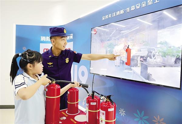 5月11日,在山东省滨州市阳信县劳店镇科普教育大厅,小朋友在消防救援队员的指导下进行模拟灭火训练。