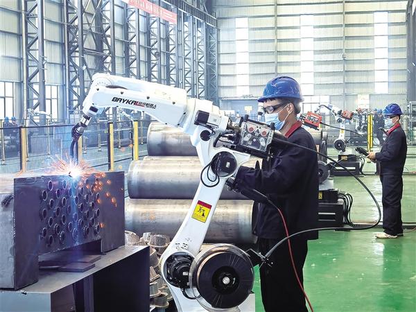 位于太康县的河南省永兴特种设备有限公司年产1000台套生物质锅炉项目总投资3亿元,年产1000台套生物质锅炉。目前,该项目已建成投产。项目满产达效后,年产值可达2亿元,实现利税2000余万元,吸纳400人就业。图为工人在操作焊接机器人进行焊接工作。记者 王映 摄
