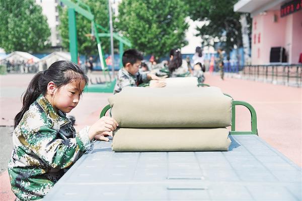 5月20日,在北京市平谷区第一小学,学生在活动中展示整理内务。
