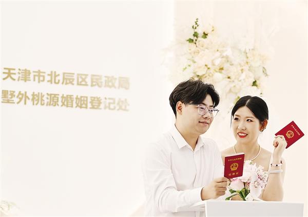 5月20日,在天津市北辰区民政局墅外桃源婚姻登记处,一对新人手持结婚证合影留念。