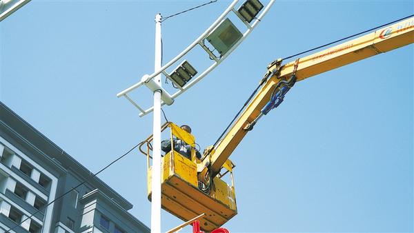 连日来,西华县城市管理局通过建立常态化排查检修机制,全面提升路灯管护水平,为群众营造安全、明亮的夜间出行环境。图为该局运维人员利用高空作业车对城区主干道上的路灯进行检修。 记者 张猛 孙靖 摄