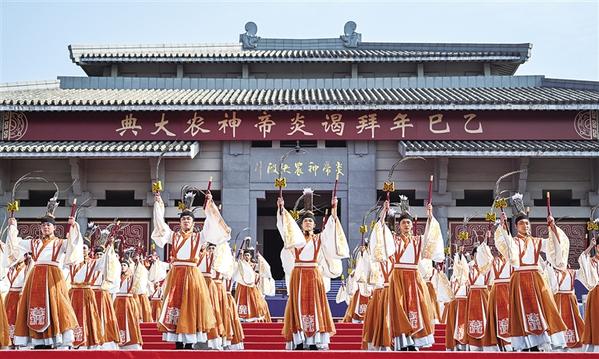 5月23日,演员在乙巳年世界华人炎帝故里寻根节上行“三献礼”,以“享酒”“五谷”“玉帛”祭祀炎帝。