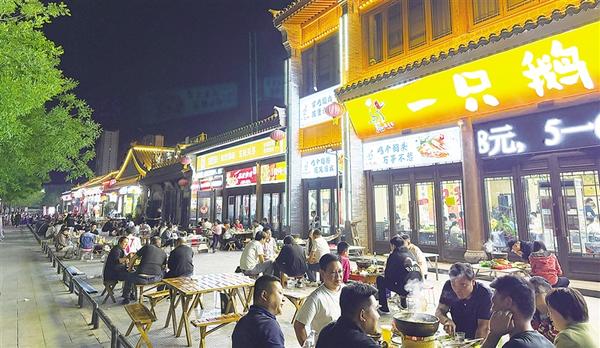 关帝庙历史街区实施“以文促旅”策略,将明清建筑风貌与现代灯光艺术相结合,吸引不少市民和游客。毗邻关帝庙的关帝老街,在夜色中化身“穿越剧场”。青石板路上,诗灯、许愿树与网红路牌吸引不少年轻人打卡拍照,铁锅炖等美食摊前食客如织。市民马锦感叹道:“这里不仅能听歌、跳舞,还能品美食。”商户郑美杰、张贺生表示:“近来,我们推出了夜宵套餐,客流量直接翻倍。”
