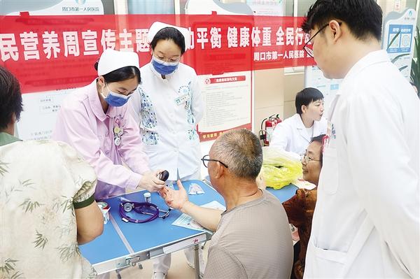 5月22日,周口市第一人民医院临床营养科联合内分泌代谢科在门诊楼开展以“吃动平衡 健康体重 全民行动”为主题的义诊活动。图为义诊现场。记者 侯俊豫 通讯员 瑛杨 摄