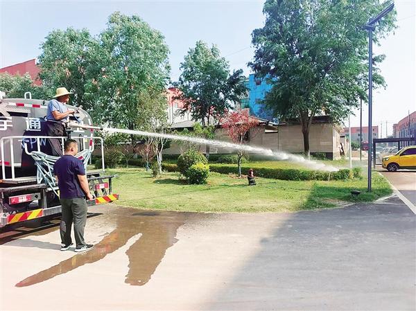 针对近期高温天气,鹿邑县城市绿地建设中心精心策划,多措并举,开展抗旱保绿工作。图为工作人员为绿化苗木浇水。