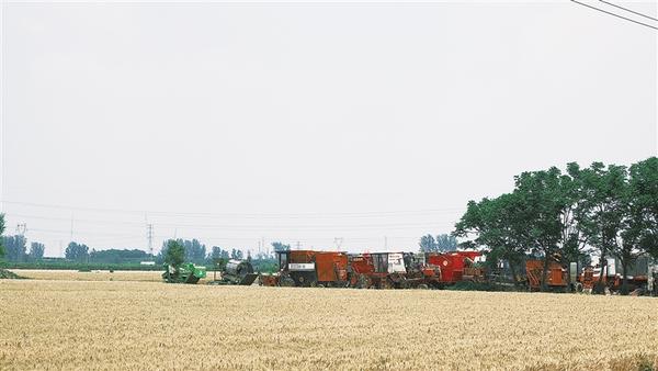 为确保小麦颗粒归仓,黄泛区农场提前做好准备工作,从检修保养农机,到合理规划收割路线,每一步都凝聚着对这片土地的深情与责任。图为收割机等待指令进田作业。